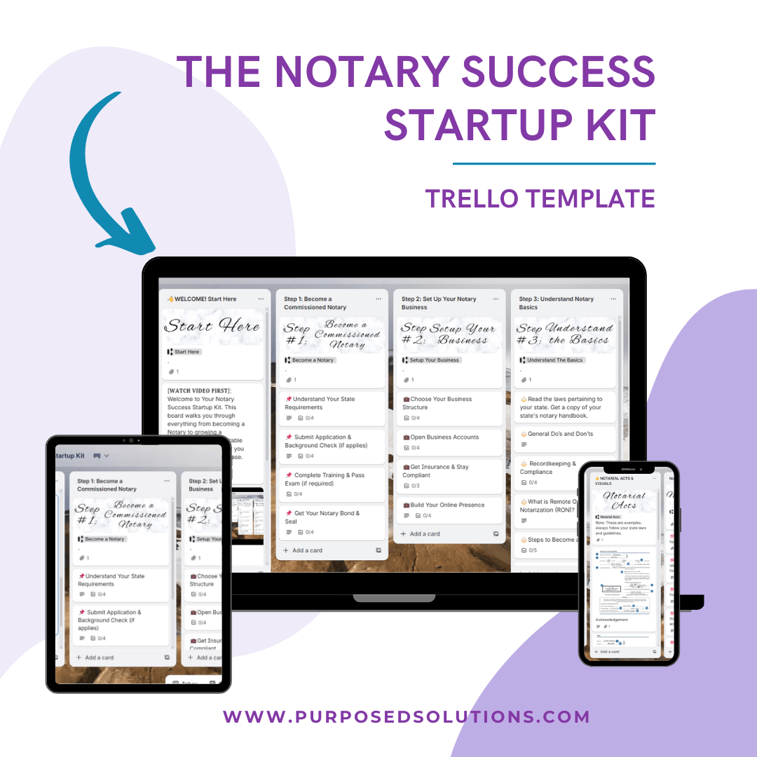 The Notary Success Starter Kit is a professionally organized Trello board designed for aspiring and newly commissioned notaries who want clear guidance, structure, and ready-to-use tools without feeling overwhelmed. Whether you are just getting started or looking to streamline your notary business setup, this board walks you step-by-step from beginner to confident professional.